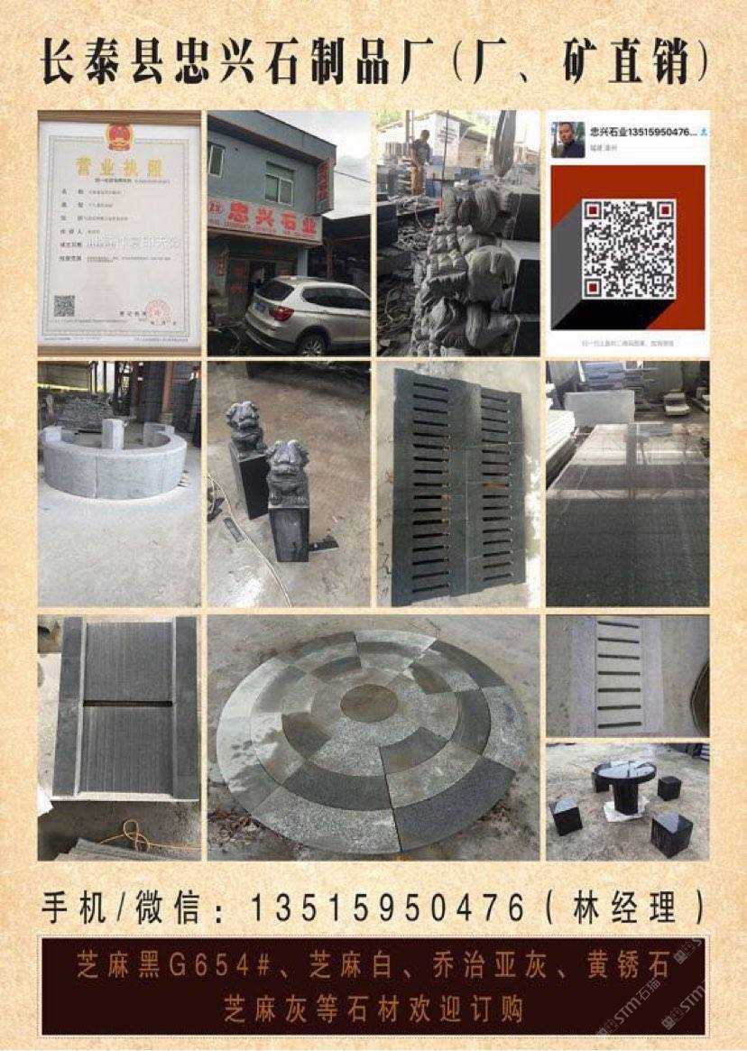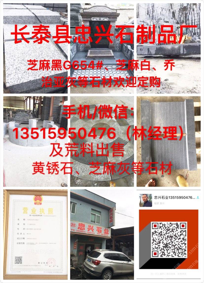 【長泰縣忠興石制品廠】礦區(qū)直銷、誠信經(jīng)營。(正常規(guī)格全部特價(jià)處理)專注:園林、市政工程.異形..別墅.荔枝面、火燒面、仿中國黑、墓碑石、荒料礦山直銷:G654芝麻黑 、G655芝麻灰 、黃銹石等。 我廠離廈門機(jī)場(50公里);距離高鐵廈門北站(40公里)導(dǎo)航地址:(長泰縣忠興石制品廠)地址:福建省長泰縣林墩美宮工業(yè)區(qū)。 電話/微信號(hào):13515950476林經(jīng)理[握手] 歡迎到工廠考察、誠信服務(wù),合作互利,感恩有你!