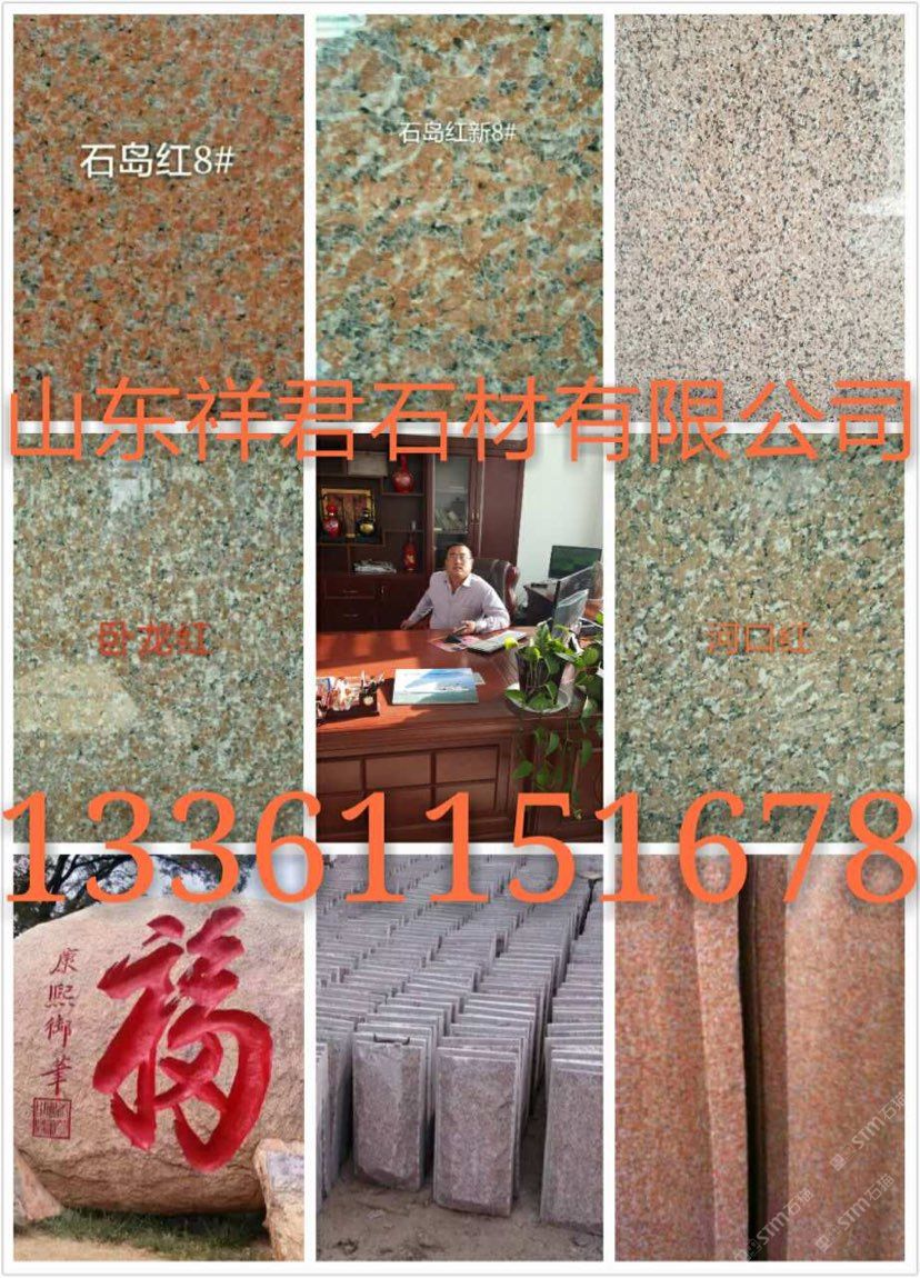 山東榮成市祥君石材有限公司廠價直銷!石島紅!!櫻花紅??!榮成灰?。』适冶ǎ。』适椰旇??。? 紫晶鉆!!皇室珍珠!!皇室玫瑰!!皇室啡!!皇室棕鉆!!中磊紅!!龍須紅!!白麻!!黃金麻??!中國棕!!文登灰!等山東石材及異型加工。全自動磨光,大型噴砂機.紅外線切割。