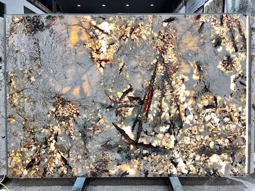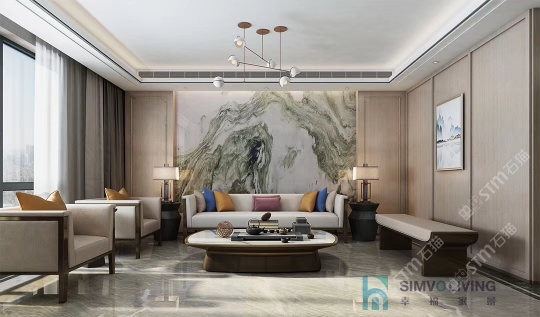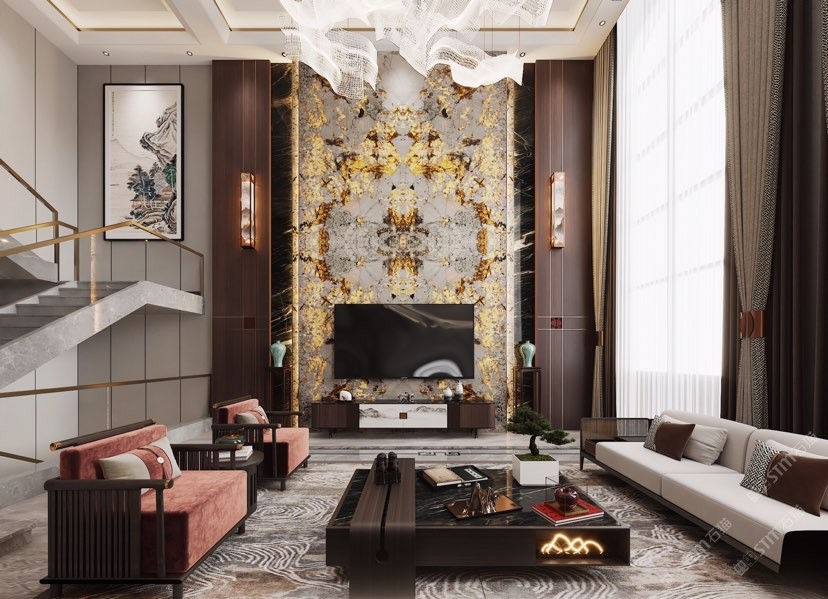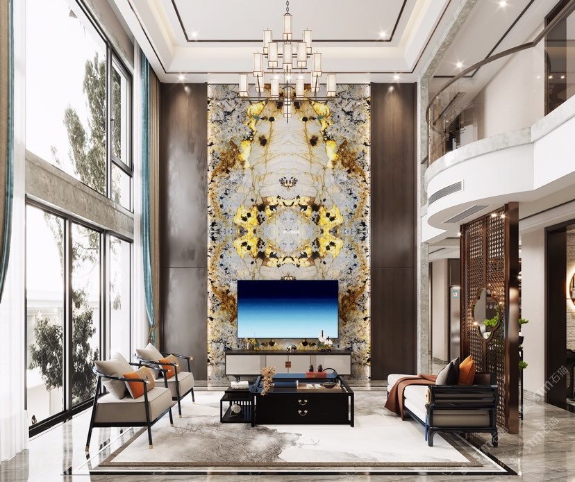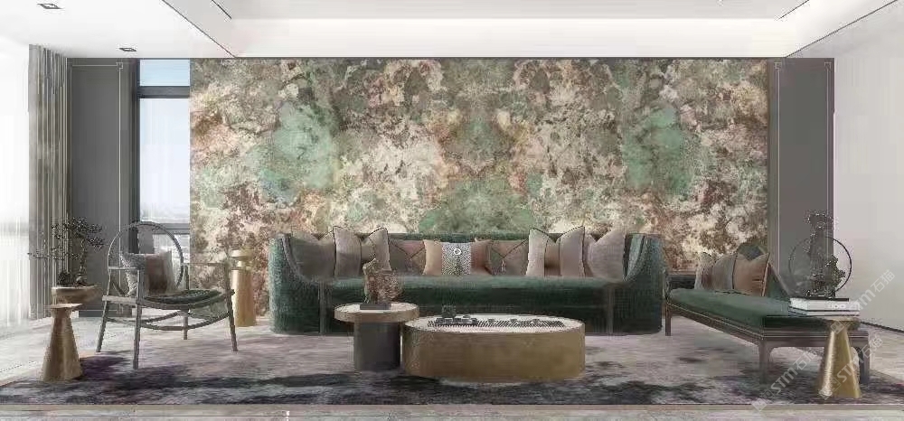 幸福家景定位于高端家裝精品石材批發(fā)商,建立了天然玉石、天然石英石、山水畫等三大板塊為主的天然石材背景墻體系!