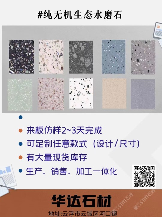 云浮市華達(dá)聚賢新型石材有限公司是一家以研發(fā)制造、加工、銷售新型人造石、天然石及其制品的企業(yè)。公司位于云浮市云安區(qū)石城鎮(zhèn)上洞村,占地面積30000平方米,年可生產(chǎn)人造無(wú)機(jī)石板材、自流平仿石材產(chǎn)品120萬(wàn)平方。公司擁有原材料生產(chǎn)配套基地,保證日常生產(chǎn)所需的石料、石粉,有成品加工生產(chǎn)車間,有直營(yíng)門店銷售,能為客戶提供從原材料選料、打樣定制、生產(chǎn)加工、工程配套等服務(wù)。華達(dá)聚賢新型石材無(wú)機(jī)水磨石、仿石材產(chǎn)品,屬于循環(huán)利用環(huán)保產(chǎn)品,所有原材料都是無(wú)機(jī)類選材,產(chǎn)品美觀實(shí)用,耐污耐磨,防火性能好,無(wú)異味,色彩斑斕,搭配元素多樣,深受國(guó)內(nèi)外設(shè)計(jì)師喜愛,適用于家具、商場(chǎng)、學(xué)校、酒店、地鐵站、政府機(jī)關(guān)、企業(yè)機(jī)構(gòu)等大型公共設(shè)施室內(nèi)外鑲貼,屬新型環(huán)保建材。公司通過GB/T19001-2016idtISO9001:2015質(zhì)量管理體系認(rèn)證和GB/T24001-2016idtISO14001:2015環(huán)境管理體系認(rèn)證。