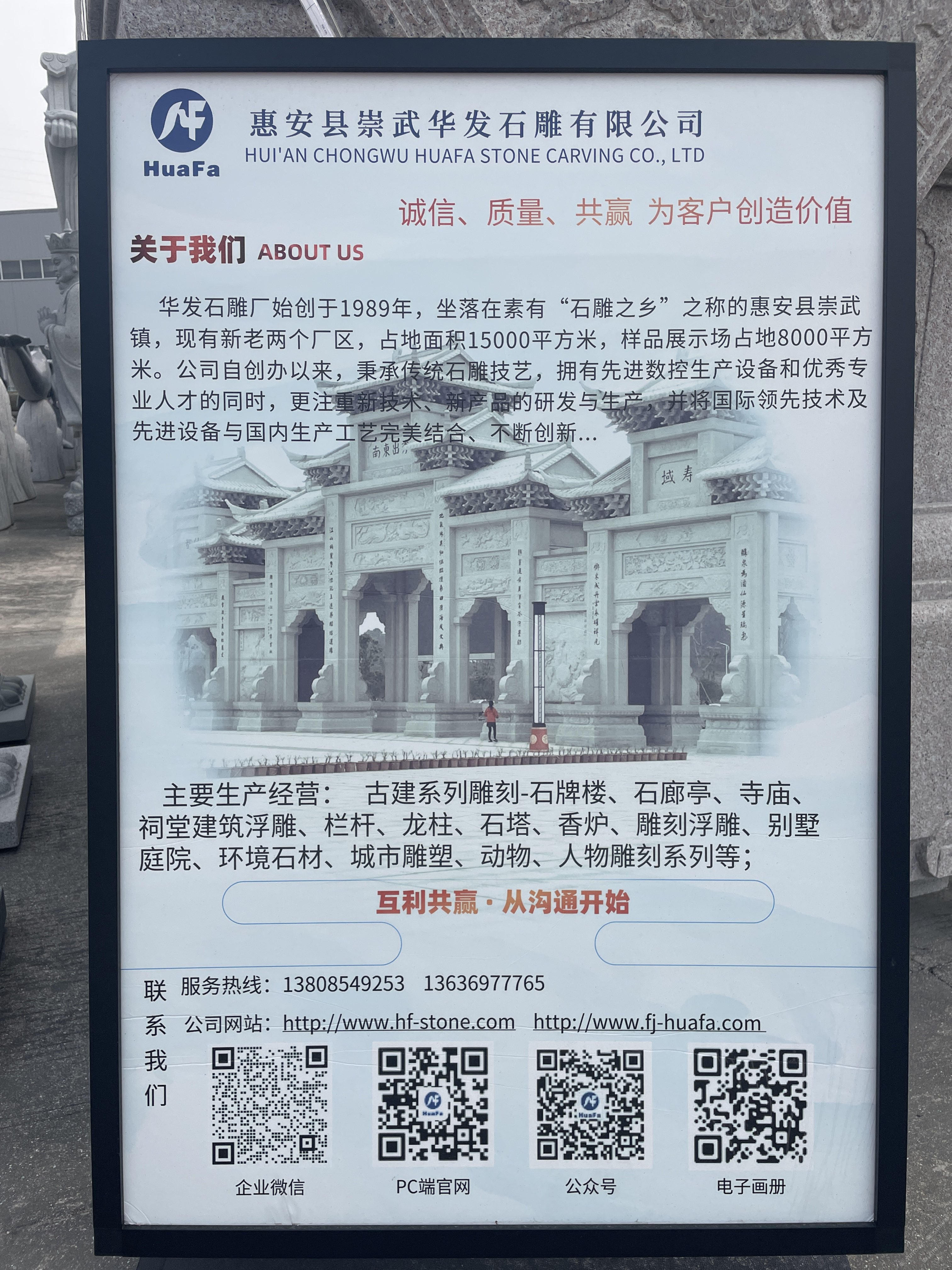 華發(fā)石雕廠始創(chuàng)于1989年,現(xiàn)有新老兩個廠區(qū),占地面積15000平方米,樣品展示場占地8000平方米。公司自創(chuàng)辦以來,秉承傳統(tǒng)石雕技藝,匯集了一批專業(yè)技術(shù)人才,企業(yè)實(shí)行科學(xué)的質(zhì)量管理體系。