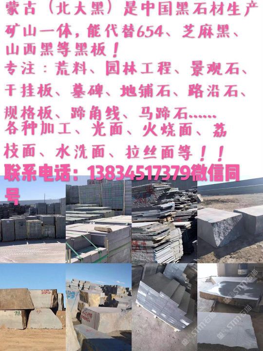 發(fā)布信息: 蒙古(北大黑)是中國黑石材生產(chǎn)礦山一體、能代替654,芝麻黑,山西黑:等黑板 ※誠信為本 專注:荒料,園林工程,景觀石,干掛板,墓碑、地鋪石、路沿石、規(guī)格板、蹄角線,馬蹄石。 各種加工、光面、火燒面、荔枝面、水洗面、拉絲面等等! 電話:13834517379微信同號(hào)
