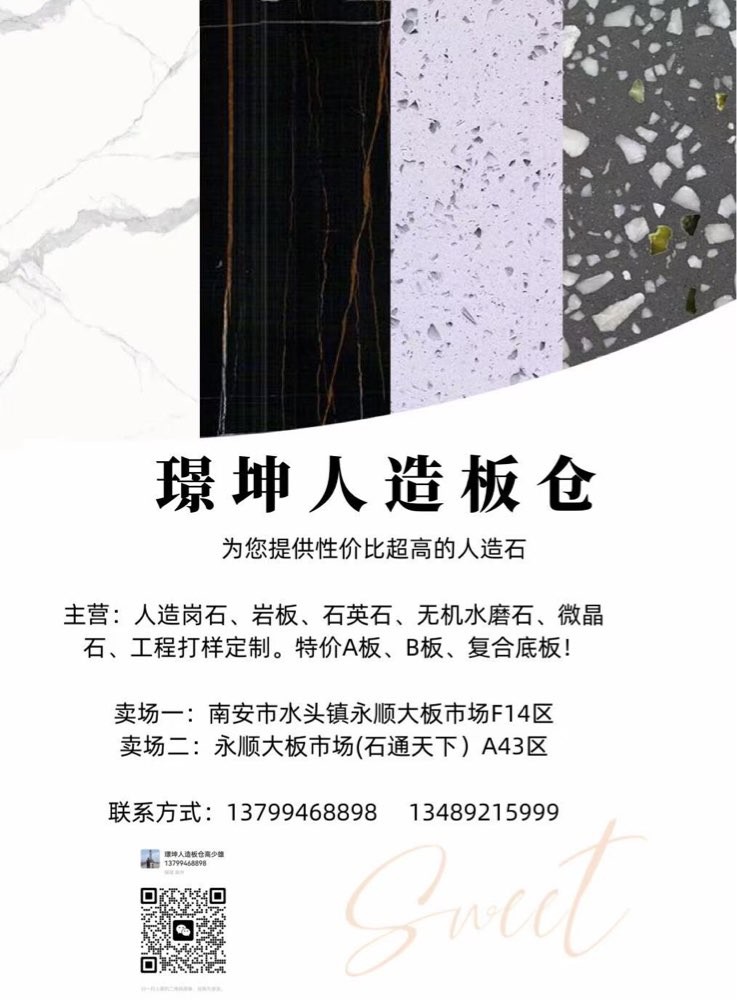 發(fā)布信息: 一璟坤人造板倉(cāng)一 主營(yíng):人造崗石,石英石,巖板,無(wú)機(jī)水磨石, 微晶石,工程打樣定制,特價(jià)A板,B板,復(fù)合底板 賣場(chǎng)地址:福建省南安市水頭鎮(zhèn)永順大板市場(chǎng)A43區(qū),F(xiàn)10一F14區(qū)。財(cái)富熱線:13799468898高先生