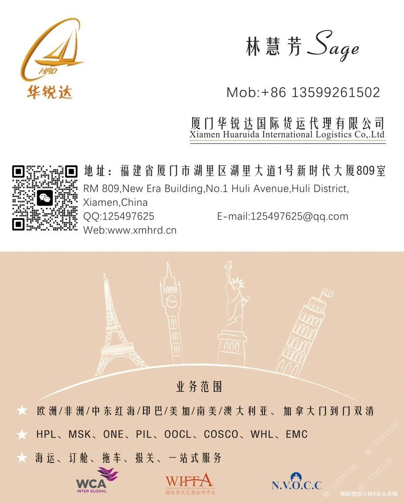 廈門華銳達國際物流有限公司 聯(lián)系人:林慧芳    135****1502 查看 135****1502 查看 主營范圍: 物流、 企業(yè)地址:福建廈門廈門湖里區(qū)湖里大道1號新時代大廈8樓809室