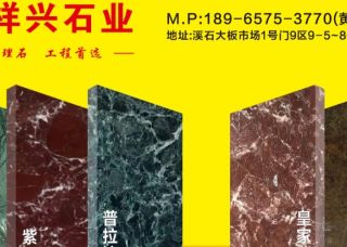 祥興石業(yè)主營(yíng)產(chǎn)品:深啡網(wǎng),紫羅紅,皇家紫檀1,大花綠,希臘大花綠,大花綠(印度),普拉達(dá)綠(希臘)企業(yè)地址:福建泉州水頭福山工業(yè)區(qū)溪石1號(hào)門9區(qū)祥興石業(yè)